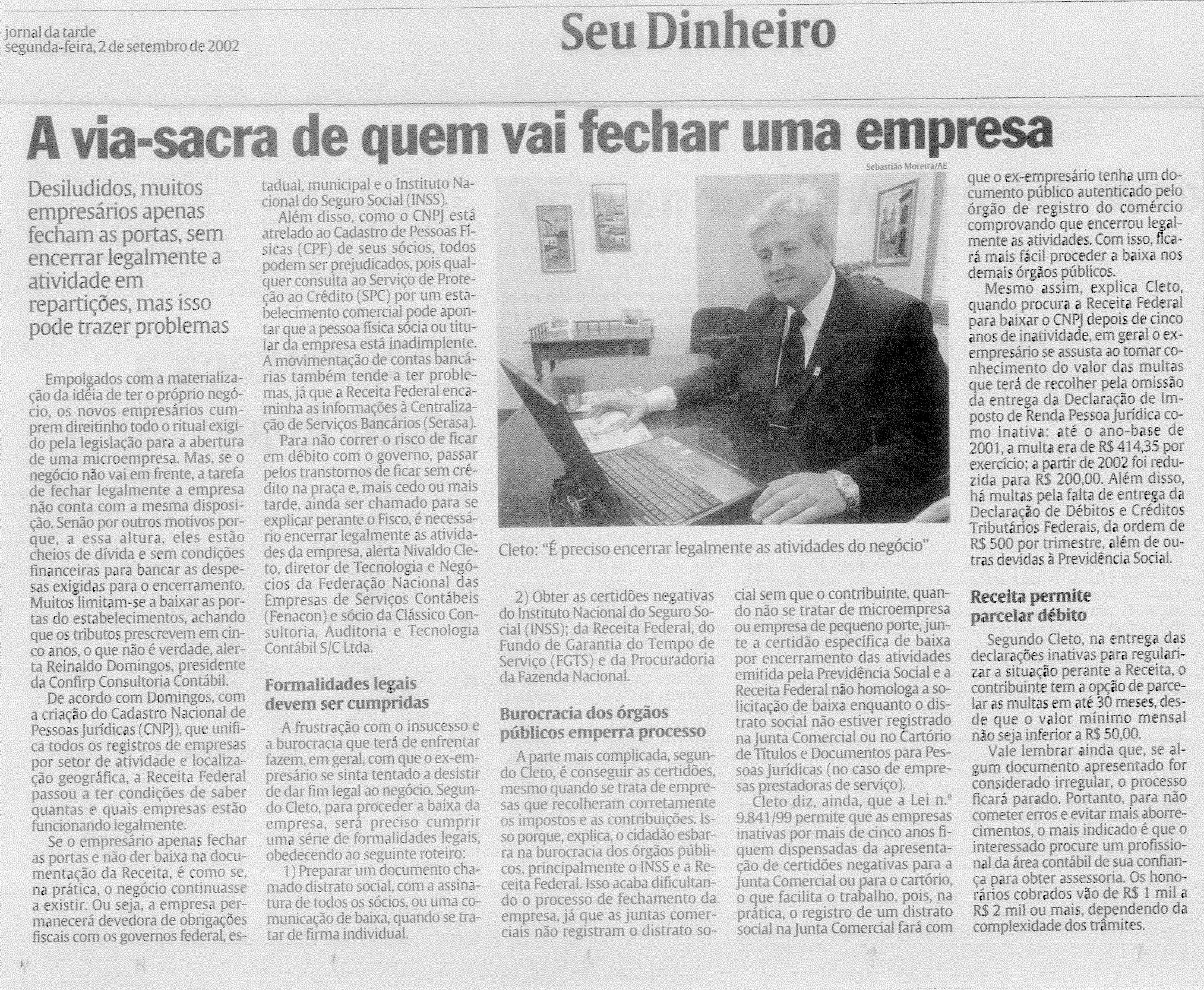 A via-sacra de quem vai fechar uma empresa – Jornal da tarde Entrevistas 2 de setembro de 2002 Leia também eSocial do empregador doméstico 5 de novembro de 2015 Entrevista do Apresentador Otávio Mesquita com o Contador Nivaldo Cleto 12 de abril de 2018 Especialistas debatem sobre a implantação da Nota Fiscal Eletrônica 20 de março de 2007