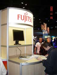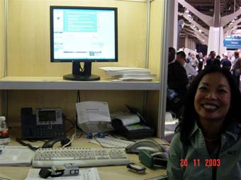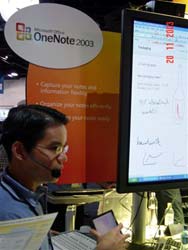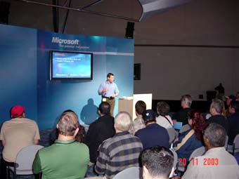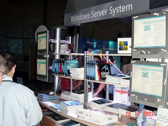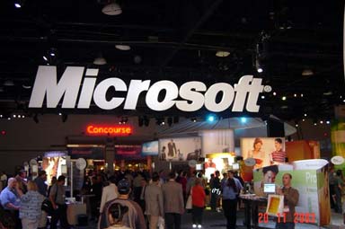Agora vou escrever sobre a maior desenvolvedora de softwares do planeta, a Microsoft, empresa que ocupou 20% do pavilhão de exposições, oferecendo todos os sistemas para usuários finais, desenvolvedores, lançamento do Office2003, todos os tipos de soluções para grandes e pequenas corporações, como o Windows Small Bussinnes 2003, Office One Note 2003 (organizador de arquivos do nosso dia a dia), sistema Windows Mobile onde encontramos diversos PDAs, Windows Server. Cada quiosque possuía três ou quatro pessoas para informar ao público as vantagens de cada sistema. Sem a menor sombra de dúvida o melhor expositor da COMDEX.