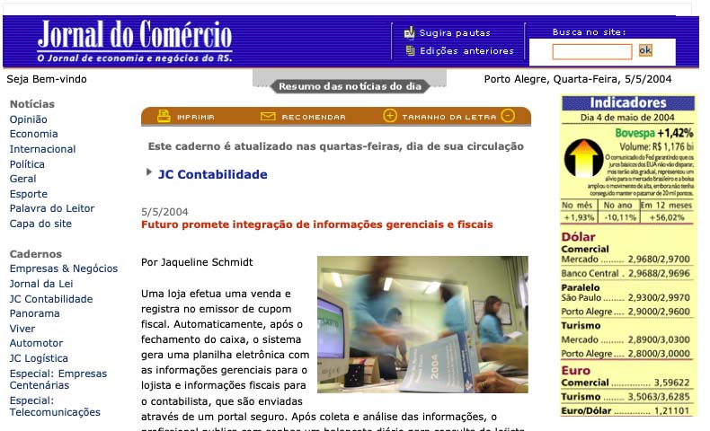 Futuro promete integração de informações gerenciais e fiscais Entrevistas 28 de maio de 2004 Clique aqui para ler o PDF (jornal_do_comercio) Leia também Revolução digital no meio empresarial 28 de setembro de 2006 Imposto Certificado 28 de dezembro de 2005 São Paulo: NF-e na marra 25 de agosto de 2006