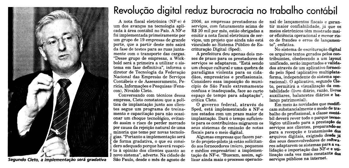 Revolução digital reduz burocracia no trabalho contábil Entrevistas 6 de setembro de 2006 Leia também Sequestros em sistemas e ataques cibernéticos nas MPEs- como fazer para se prevenir 31 de outubro de 2016 Entrevista para a TV Contábil – Baixada Santista 27 de fevereiro de 2013 Tecnologia econômica e ecológica 15 de novembro de 2005